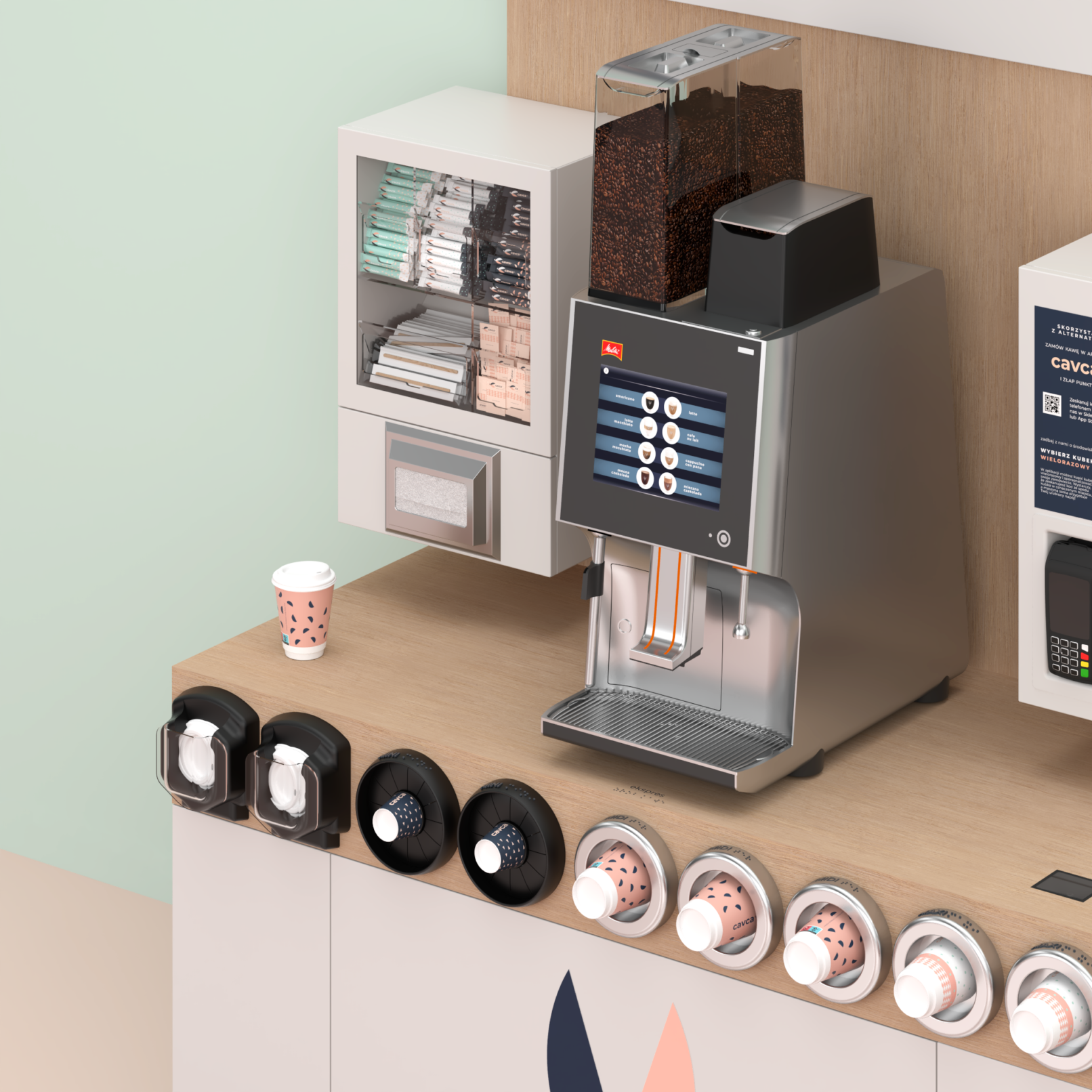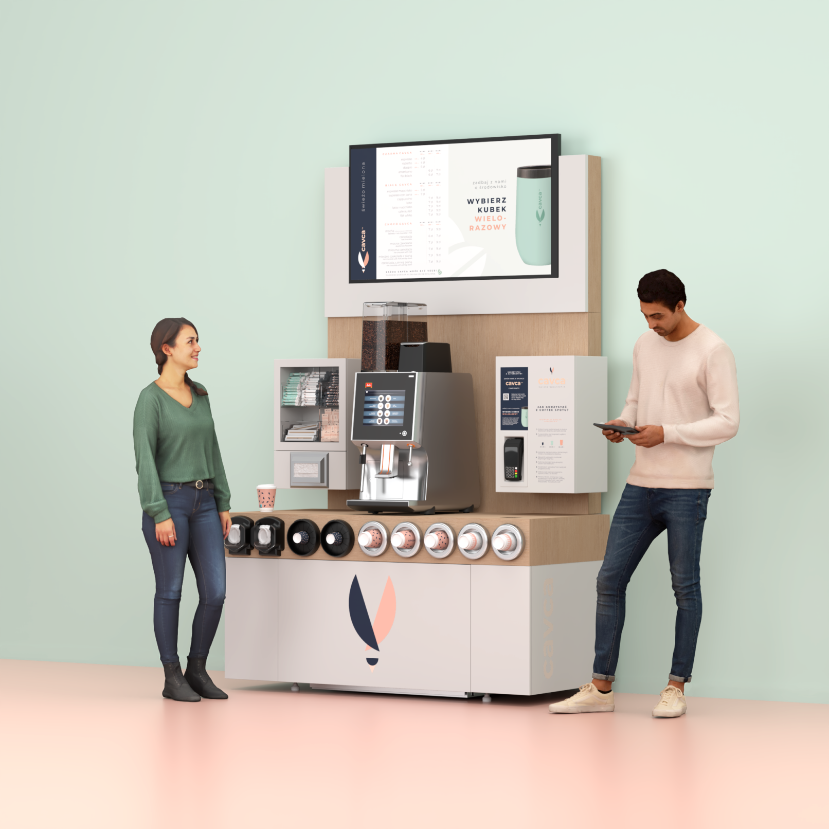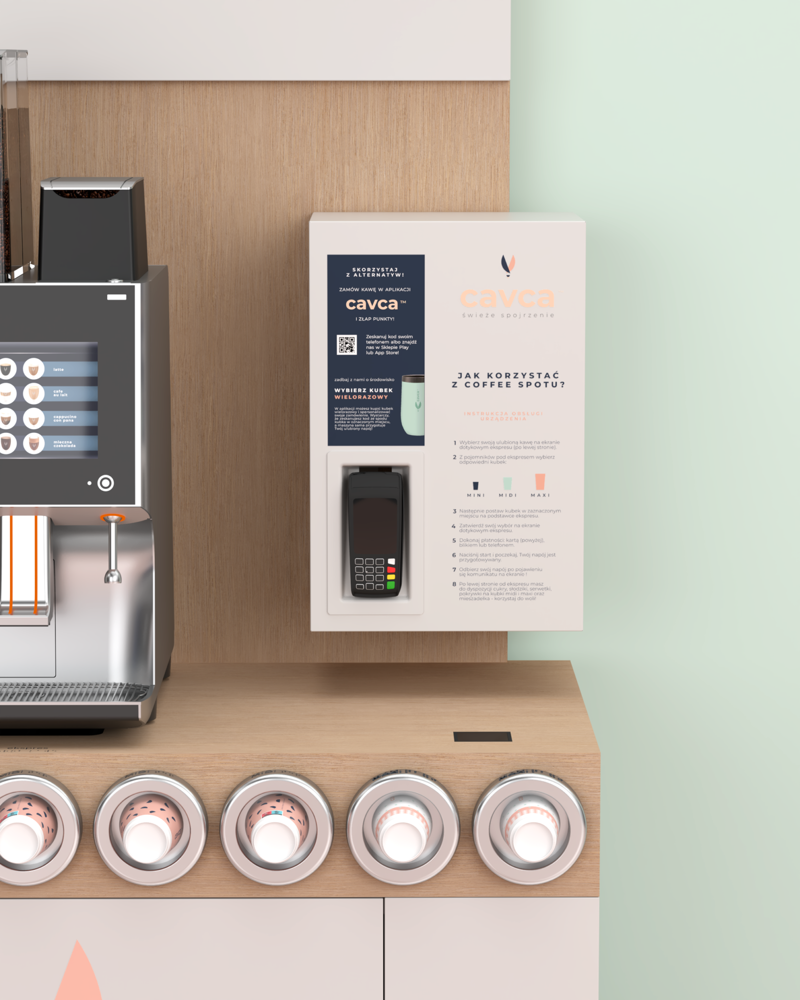 CAVCA to coś więcej niż maszyna vendingowa – to nowatorski, samoobsługowy punkt kawowy o unikalnym designie. Głównym założeniem podczas projektowania maszyny było odejście od typowego wyglądu maszyny vendingowej a zarazem stworzenie przestrzeni o nowoczesnym ale ciepłym charakterze. Dominującą grupą docelową urządzenia są studenci oraz młodzi ludzie, dlatego kształt, kolorystyka oraz elementy wykończenia zostały pieczołowicie zaprojektowane w stylistyce dopasowanej do przewidywanego odbiorcy.