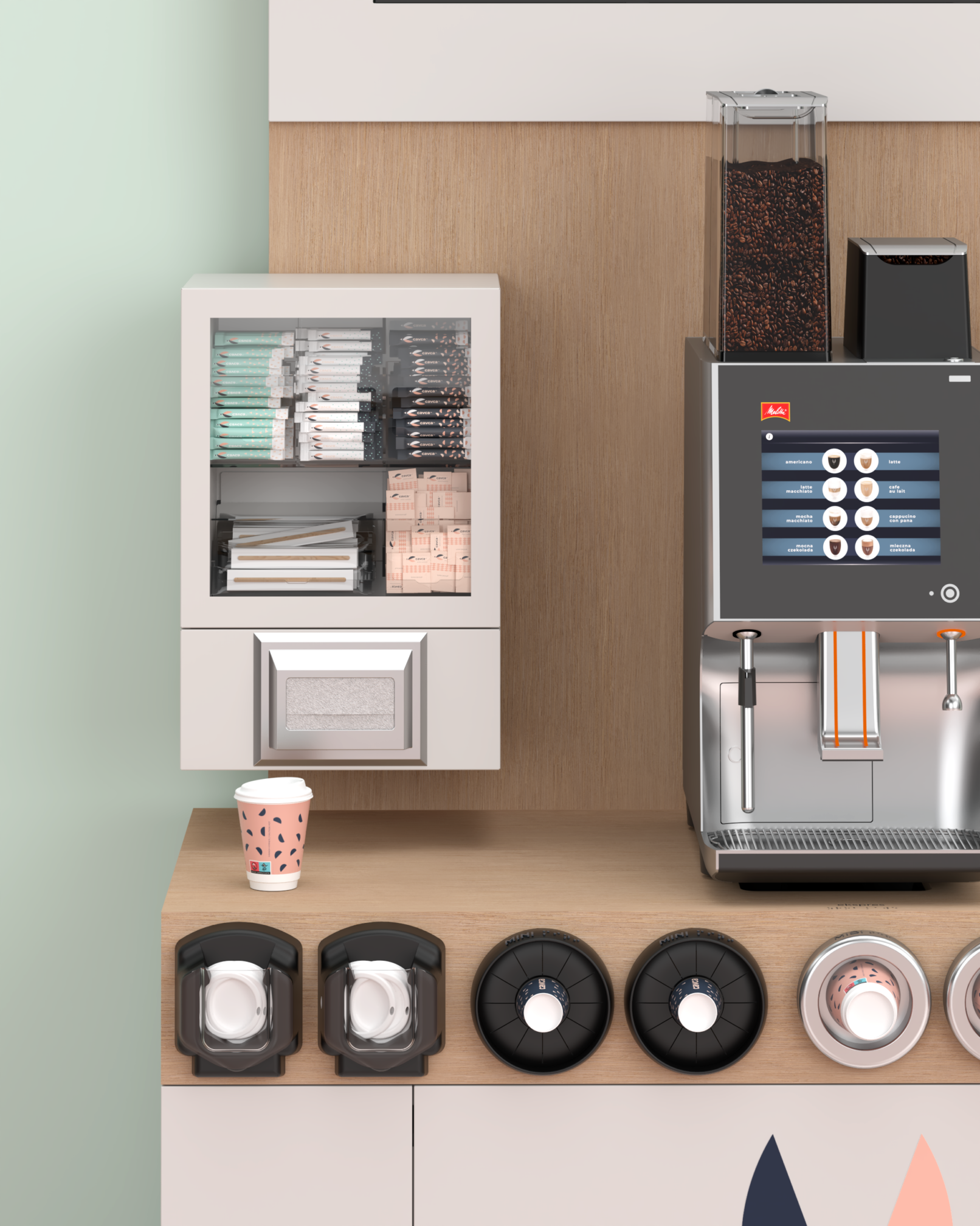 - Punkt jest wyposażony w ekspres do kawy z ekranem dotykowym, szafkę z dodatkami, czytnik kodów QR oraz duży ekran dostarczający bieżących informacji o dostępnych produktach i promocjach, a także instrukcję obsługi.